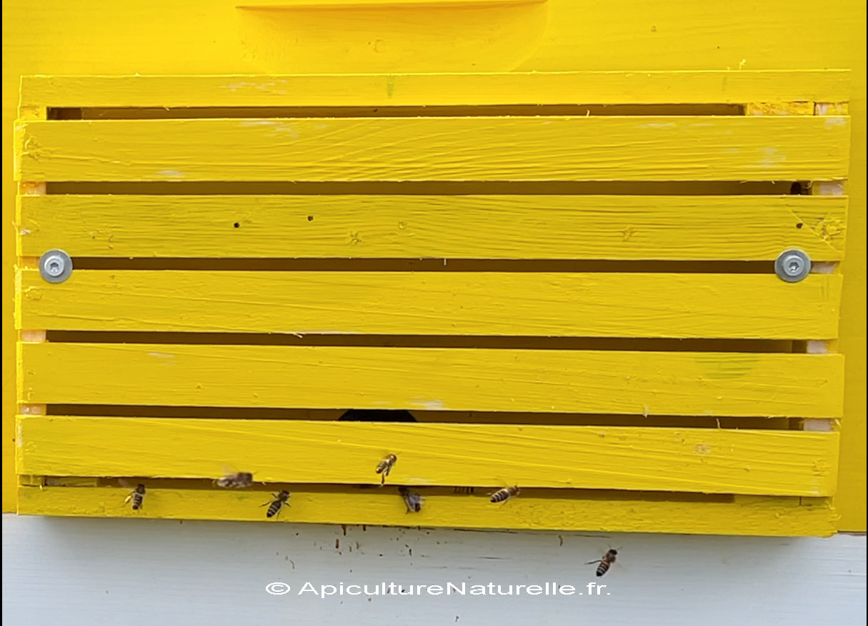 L’ouverture ronde du trou d’envol reste ainsi protégée, même lorsque la population d’abeilles diminue et que les gardiennes ne peuvent plus fermer complètement l’entrée.