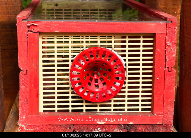 C’est pourquoi on a retiré l’entonnoir d’entrée Innox et l’a remplacé par le couvercle BeeDefender, qu’on utilise aussi pour les récipients en verre dans lesquels les gros insectes ne peuvent pas entrer, mais dans lesquels les frelons européens peuvent malheureusement parfois s’introduire.